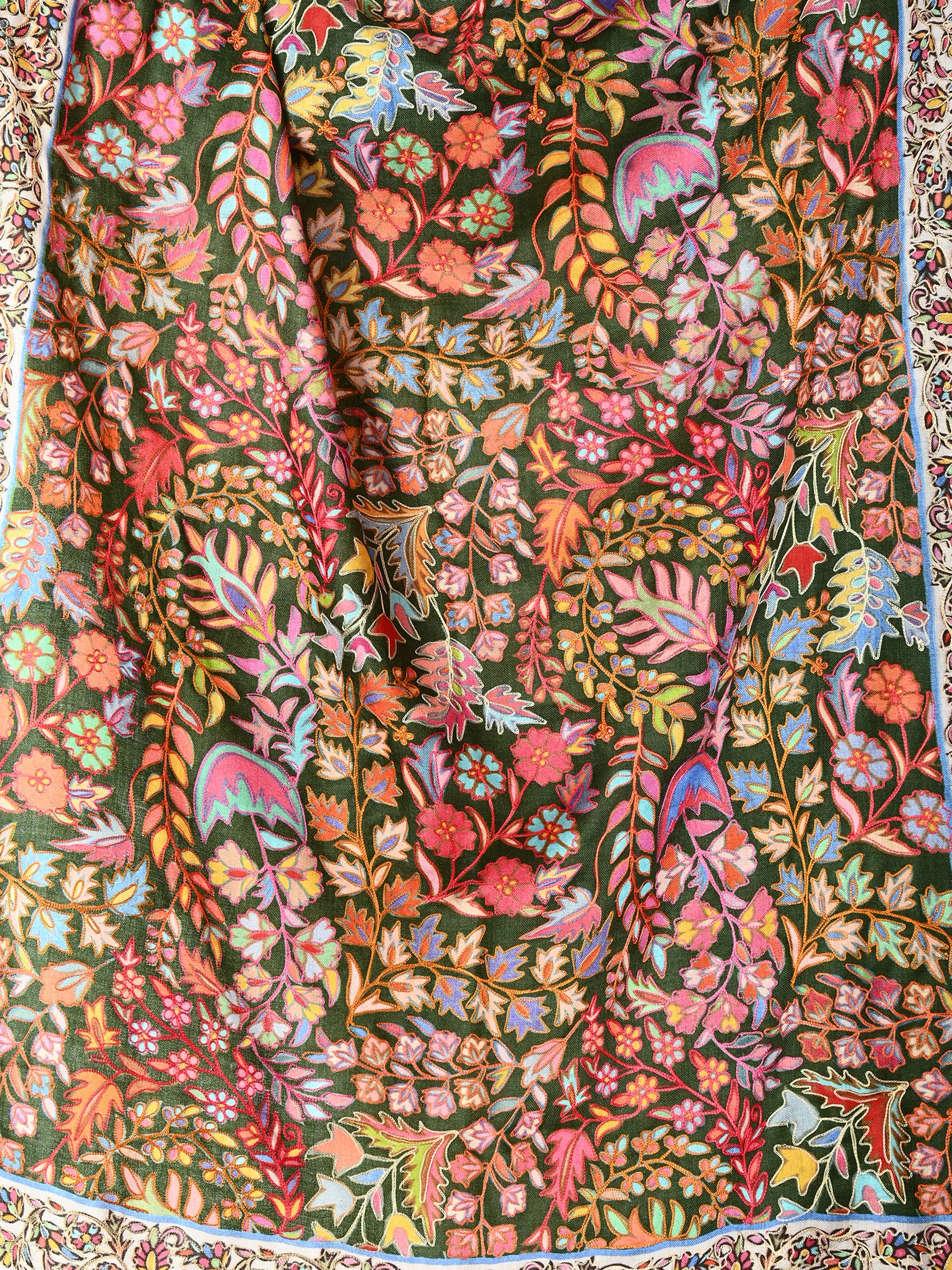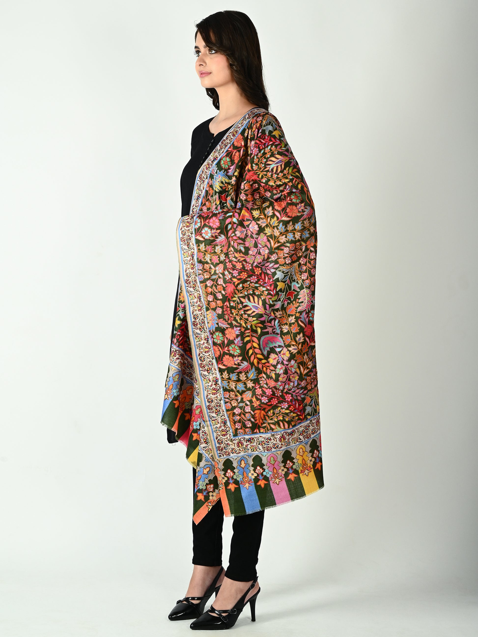 Step into a world of timeless elegance with the Gulistan Jamawar Kani Stole. A true masterpiece of Kashmiri artisanship, this stole features a deep, majestic emerald green canvas brought to life by a breathtaking kaleidoscope of hand-woven floral motifs.