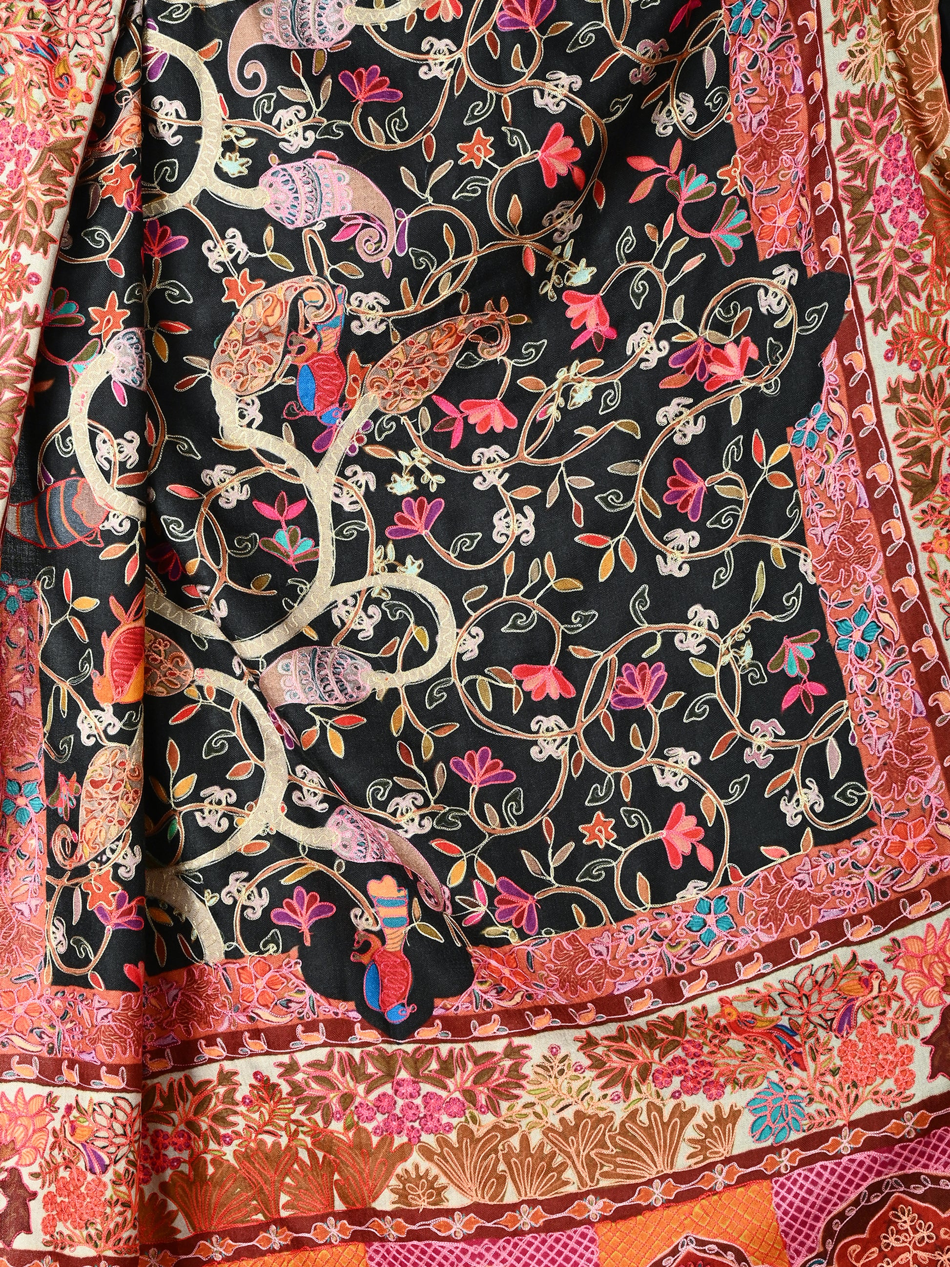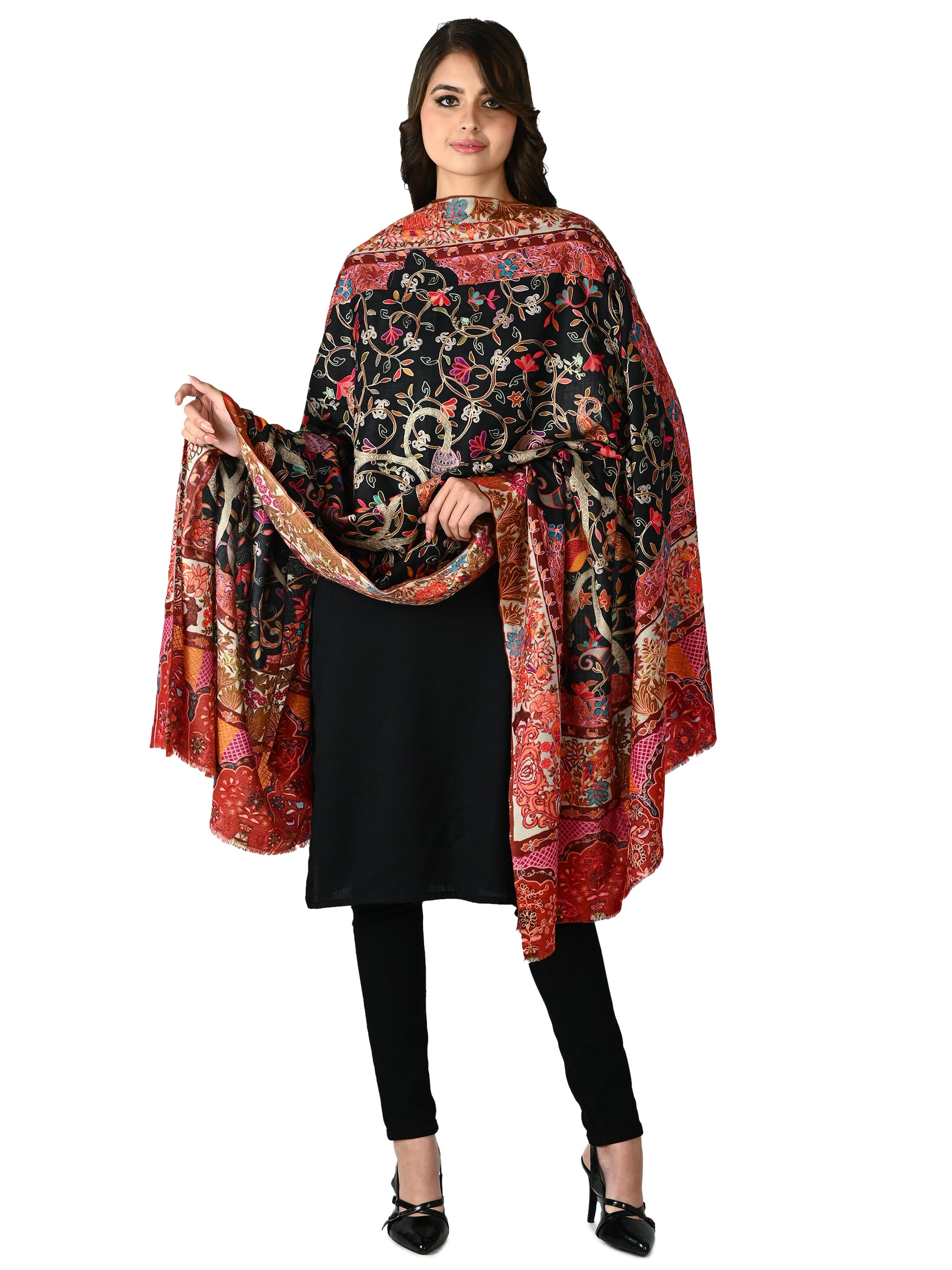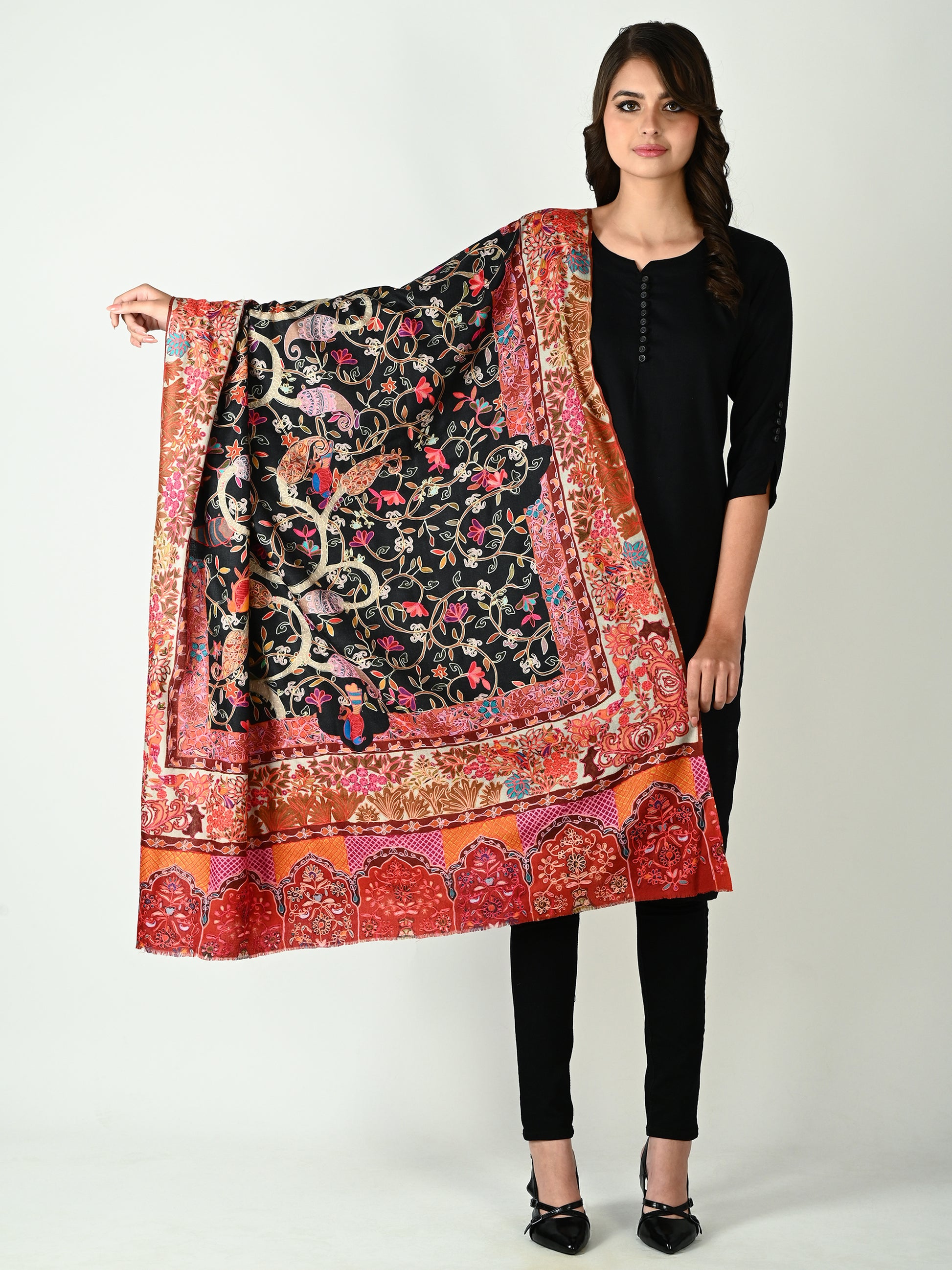 टेराकोटा और लाल भूरे रंग में दमकते, समृद्ध रूप से विस्तृत किनारे, केंद्रीय कलात्मकता को कश्मीरी शरद ऋतु के गर्म आलिंगन की तरह ढ़ालते हैं। प्रत्येक आकृति पर बारीकी से कढ़ाई की गई है, जो सदियों पुरानी शिल्पकला को श्रद्धांजलि है, जिससे एक ऐसा शॉल बनता है जो जितना कालातीत है उतना ही नाटकीय भी है।