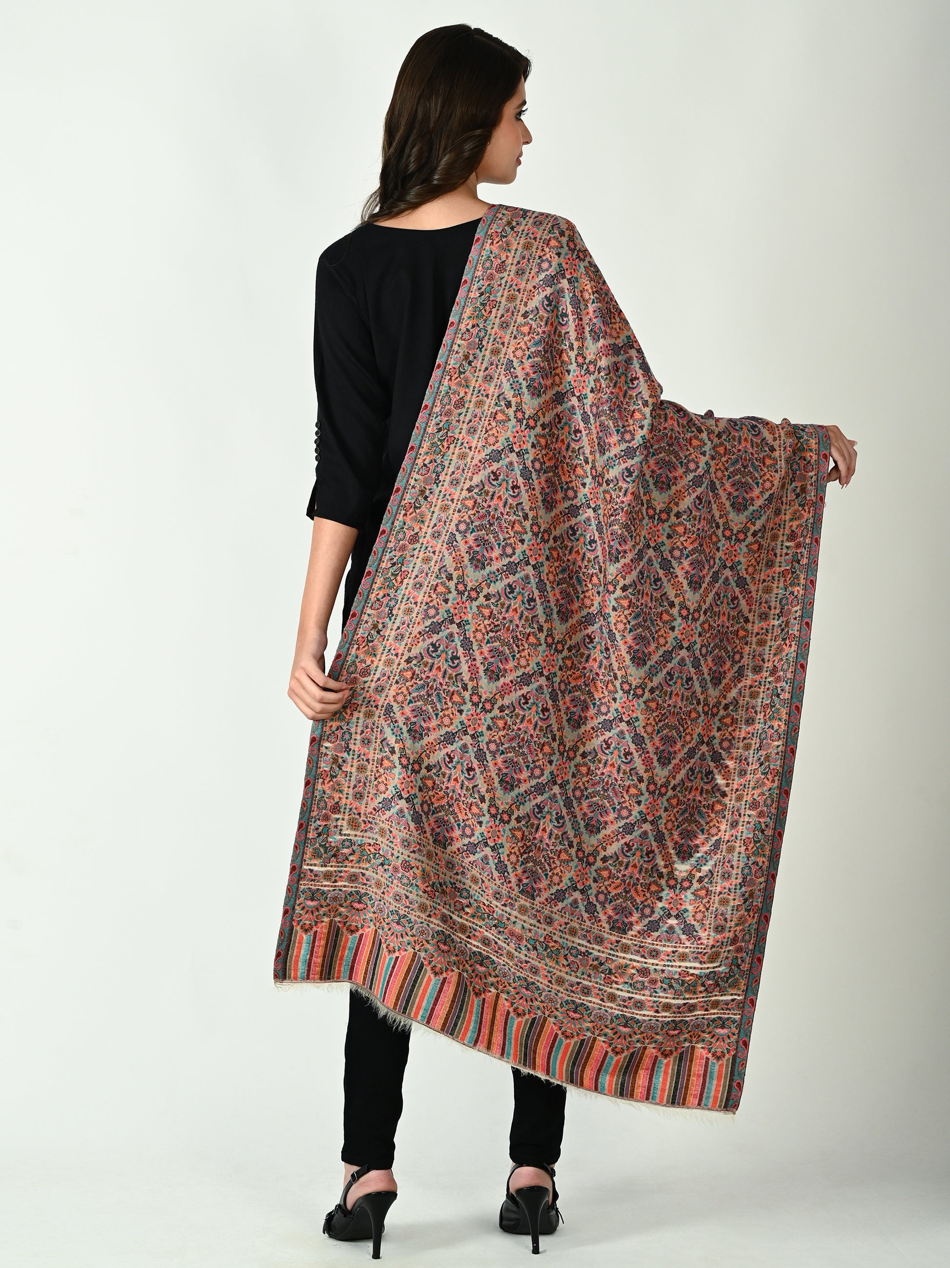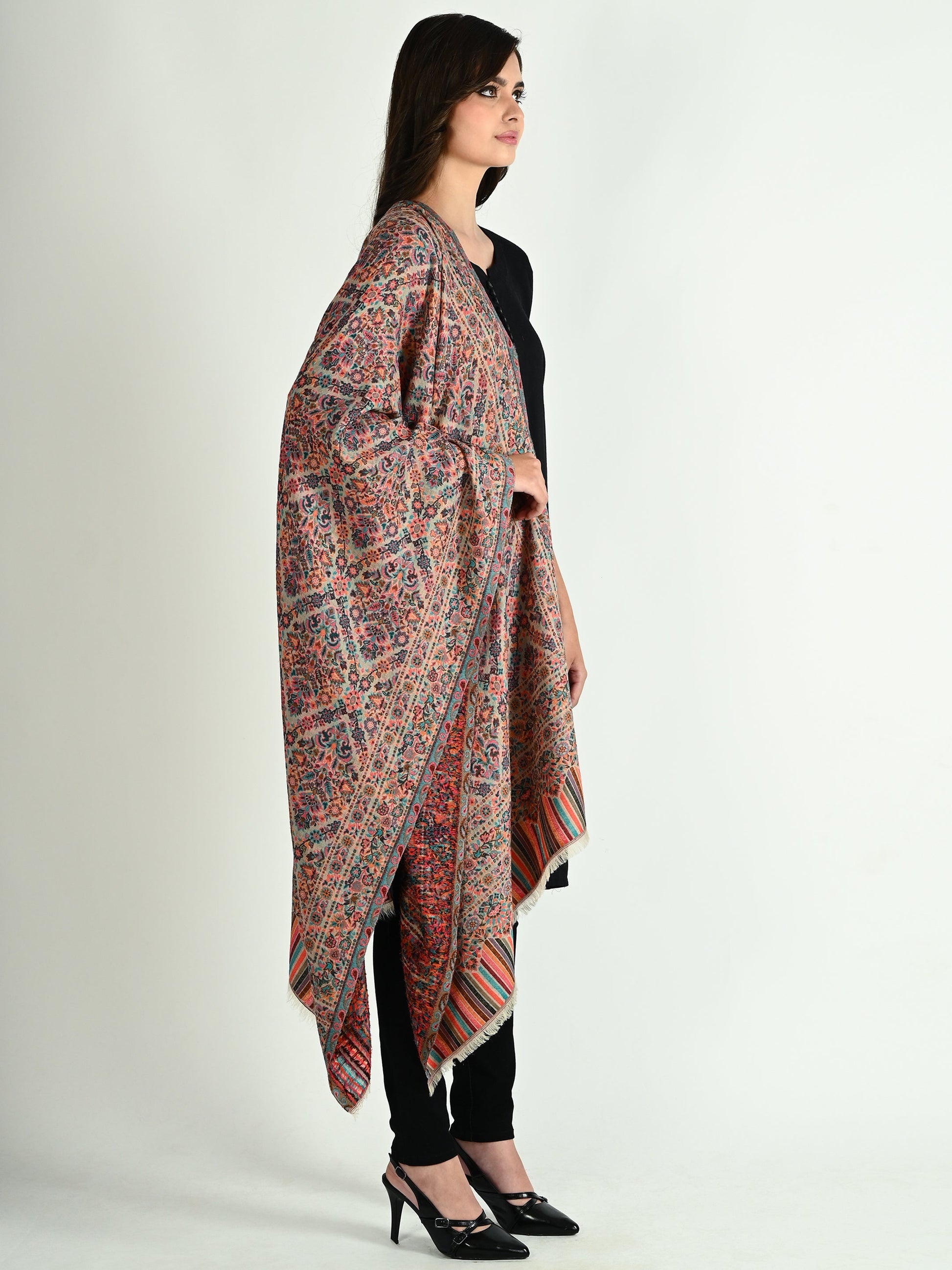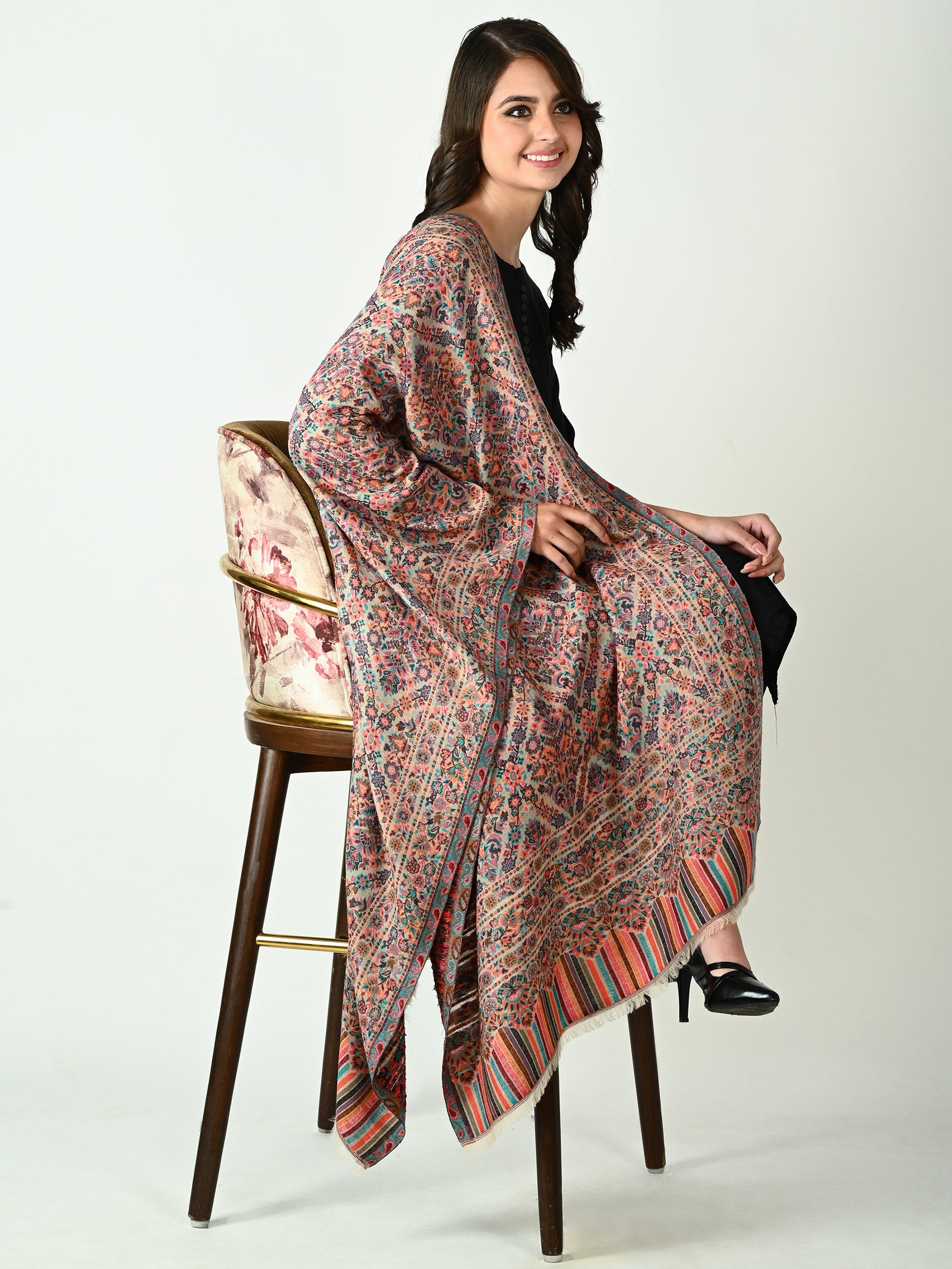 The design features a delicate lattice of floral and paisley motifs, reminiscent of blooming chinars and valley meadows in spring. Soft tones of rose, coral, teal, and saffron interplay gracefully over a muted base, giving the stole a gentle radiance that flatters in any light. A subtle striped border completes the piece, adding a hint of modern refinement to this timeless heirloom.