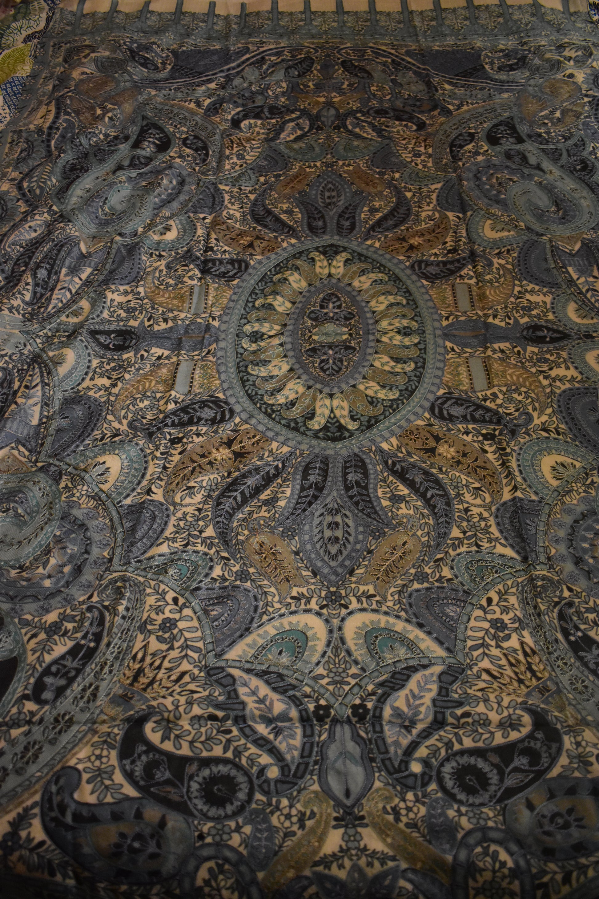 Step into the quiet elegance of the night sky with the Lunar Veil Kalamkari Shawl. Inspired by the soft glow of the moon, this masterpiece carries a dreamlike palette of greys, indigos, lilacs, and muted teals. The flowing paisley motifs and intricate Kalamkari artistry evoke a celestial rhythm — serene, mysterious, and timeless.