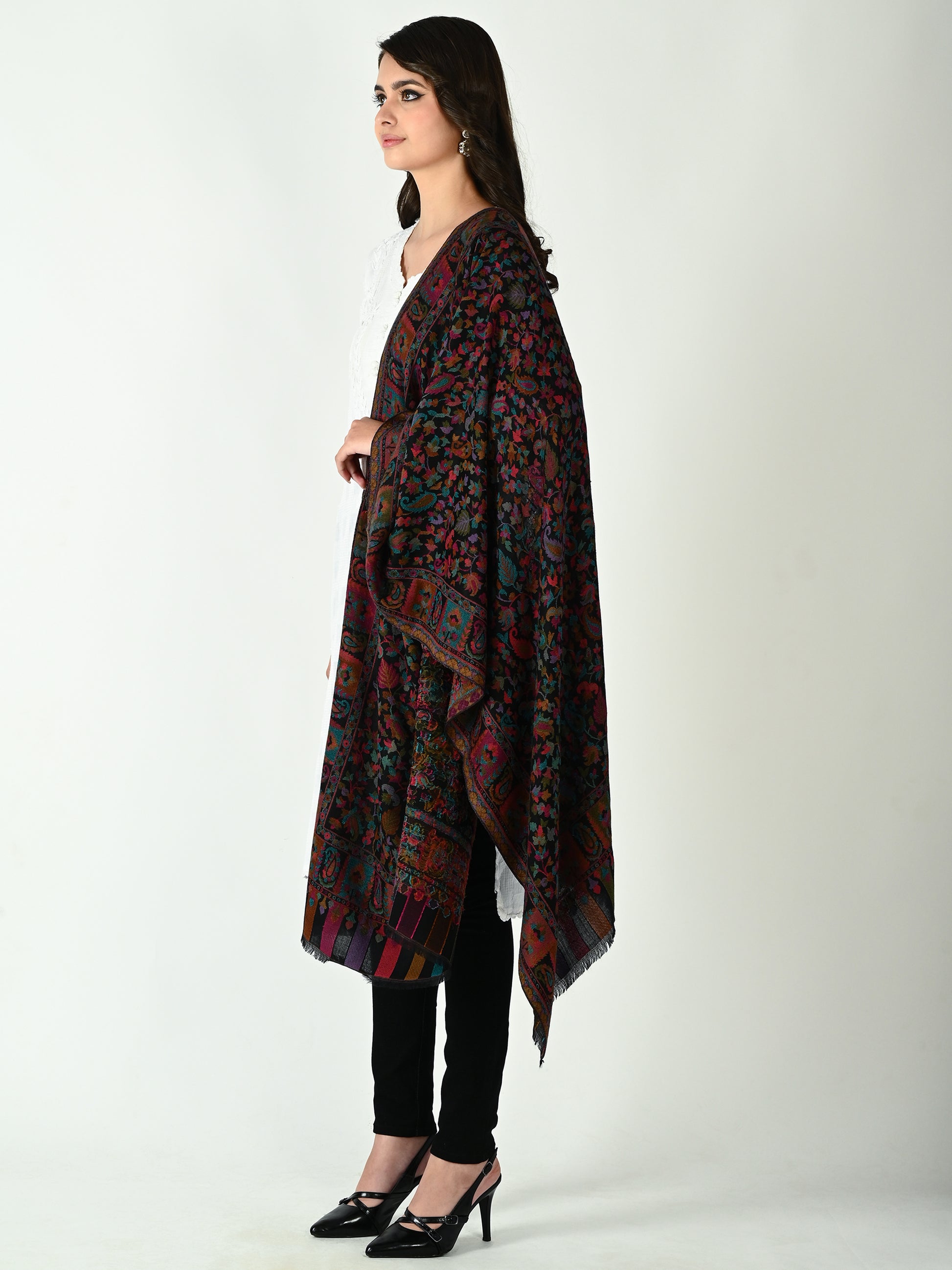 Rich hues of magenta, teal, amethyst, and copper are meticulously woven into an intricate Jamawar tapestry. The design beautifully honors Kashmiri tradition, featuring iconic, sweeping paisley (boteh) motifs interlaced with delicate floral vines. The stole is masterfully framed by a highly detailed, structured border and finished with striking, color-blocked stripes at the hem, adding a touch of modern geometric flair to the classic silhouette.