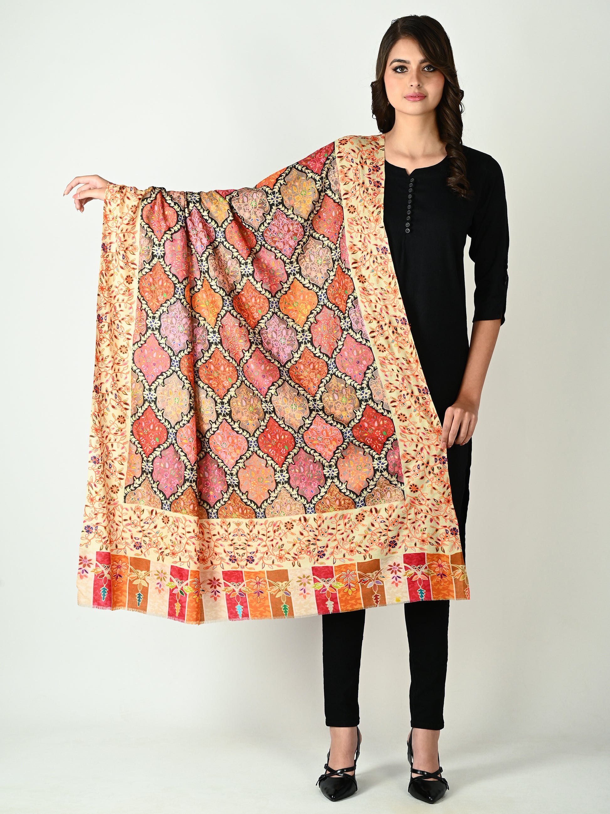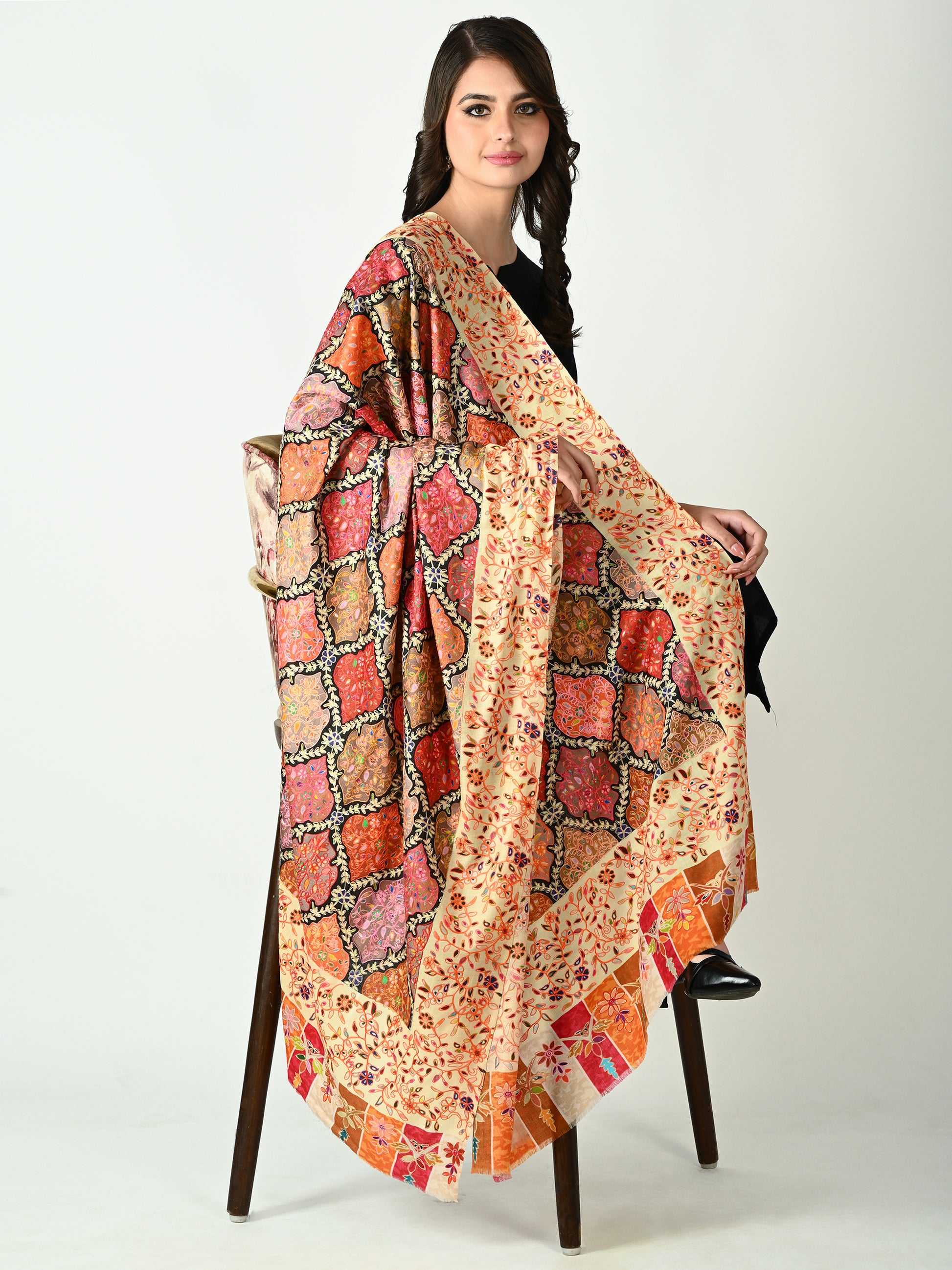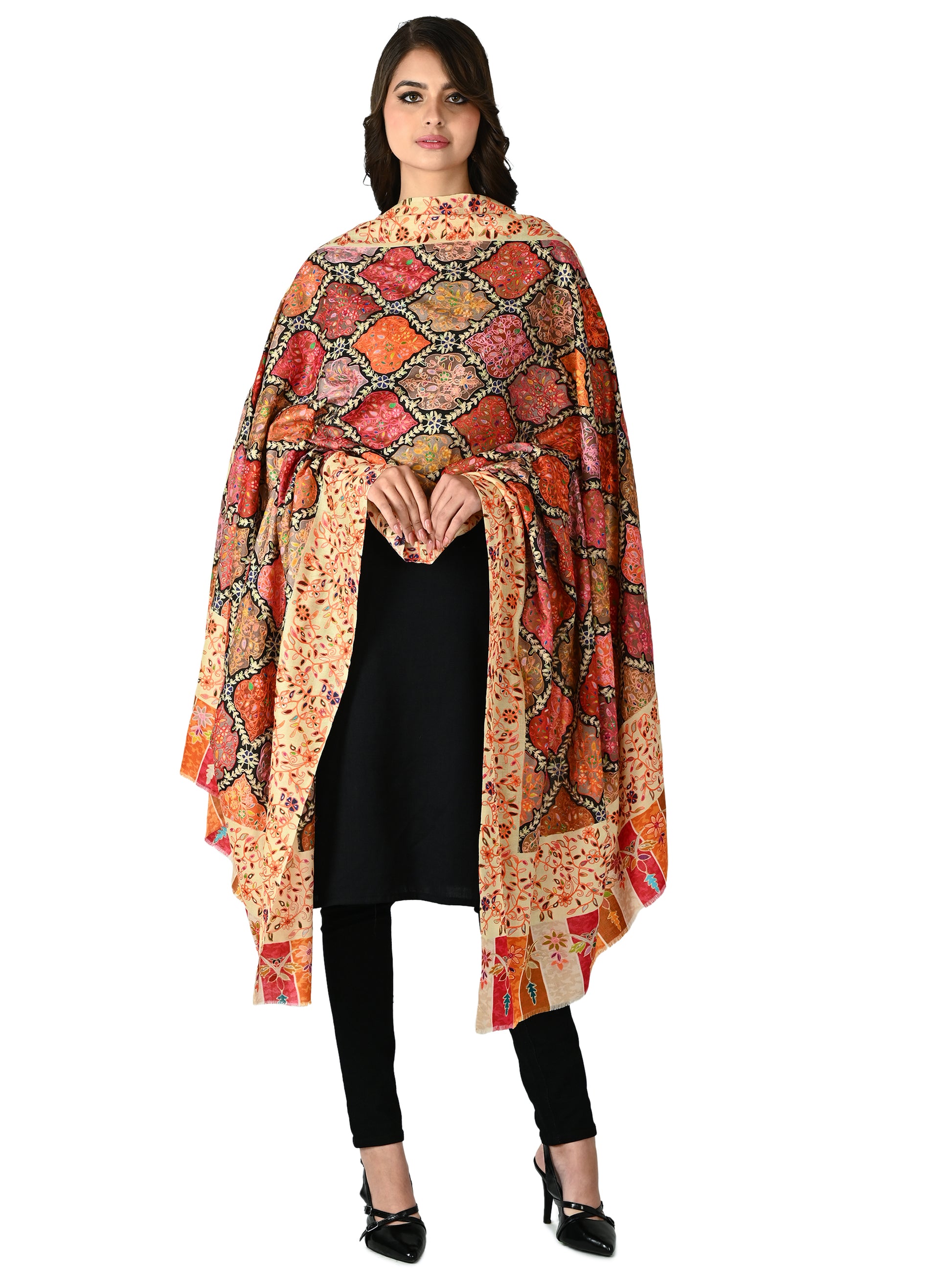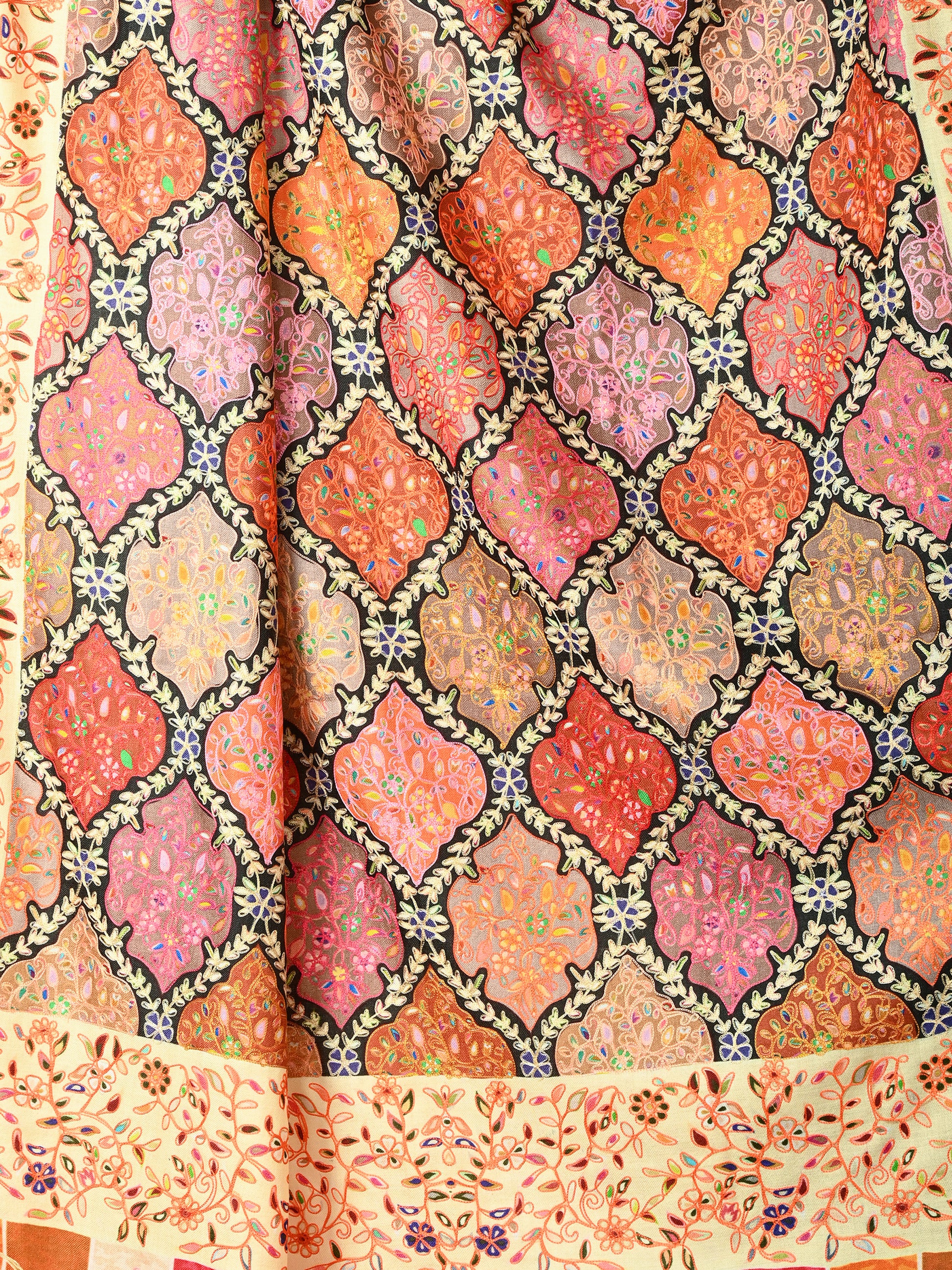 ڈیزائن نرم کریم کی سرحدوں میں اپنا توازن تلاش کرتا ہے، آہستہ سے بیلوں کے ساتھ تفصیل سے جو مرکزی موزیک کی بھرپوریت کے خلاف لطیف فضل کا ایک لمس شامل کرتی ہے۔ گرم، مٹی سے بھری، اور خوبصورتی سے تفصیلی، یہ شال ایک حقیقی وراثت کی چمک رکھتی ہے — جو روایت کی بات کرتی ہے جبکہ آج بھی آسانی سے پہننے کے قابل ہے۔