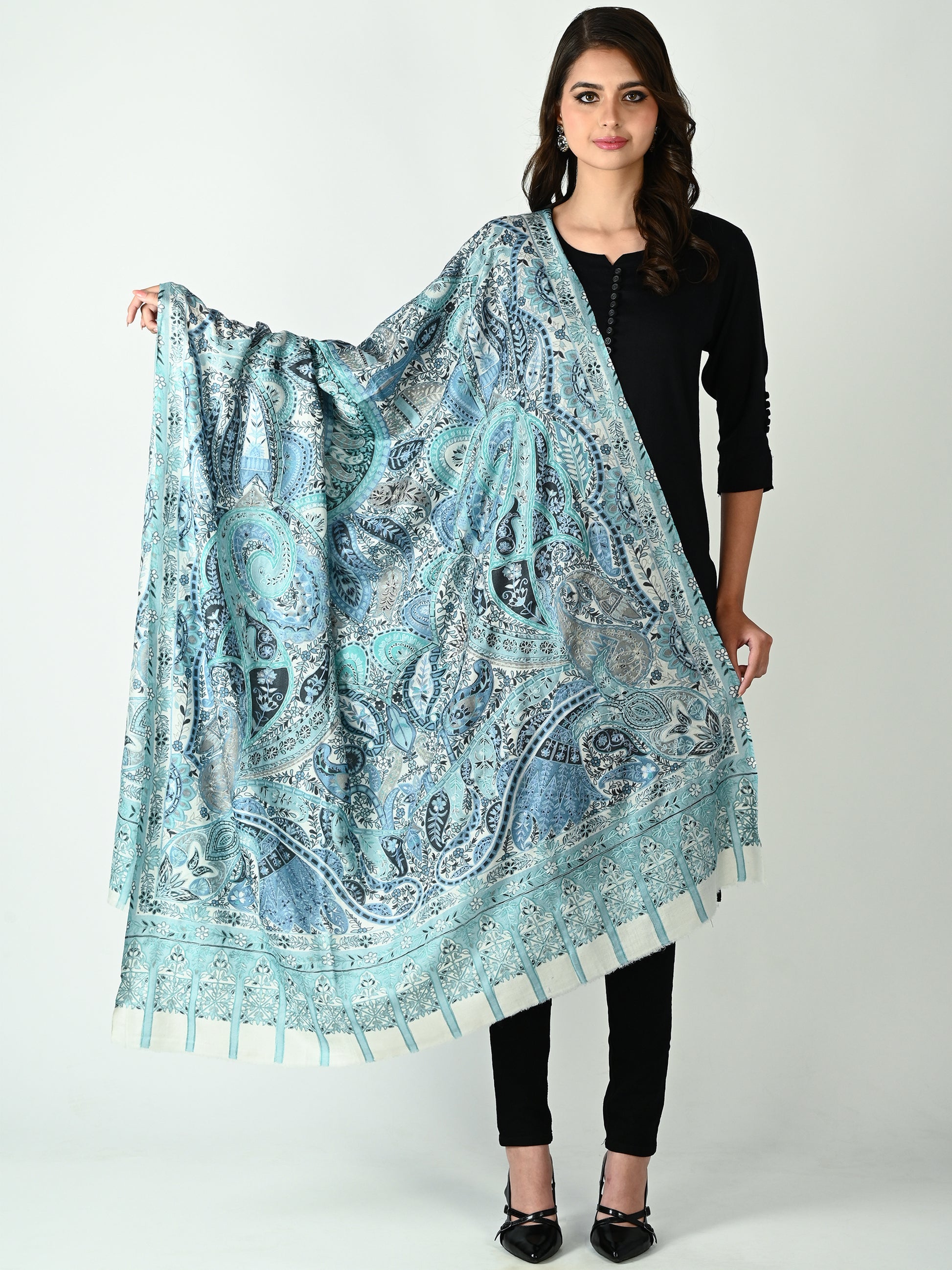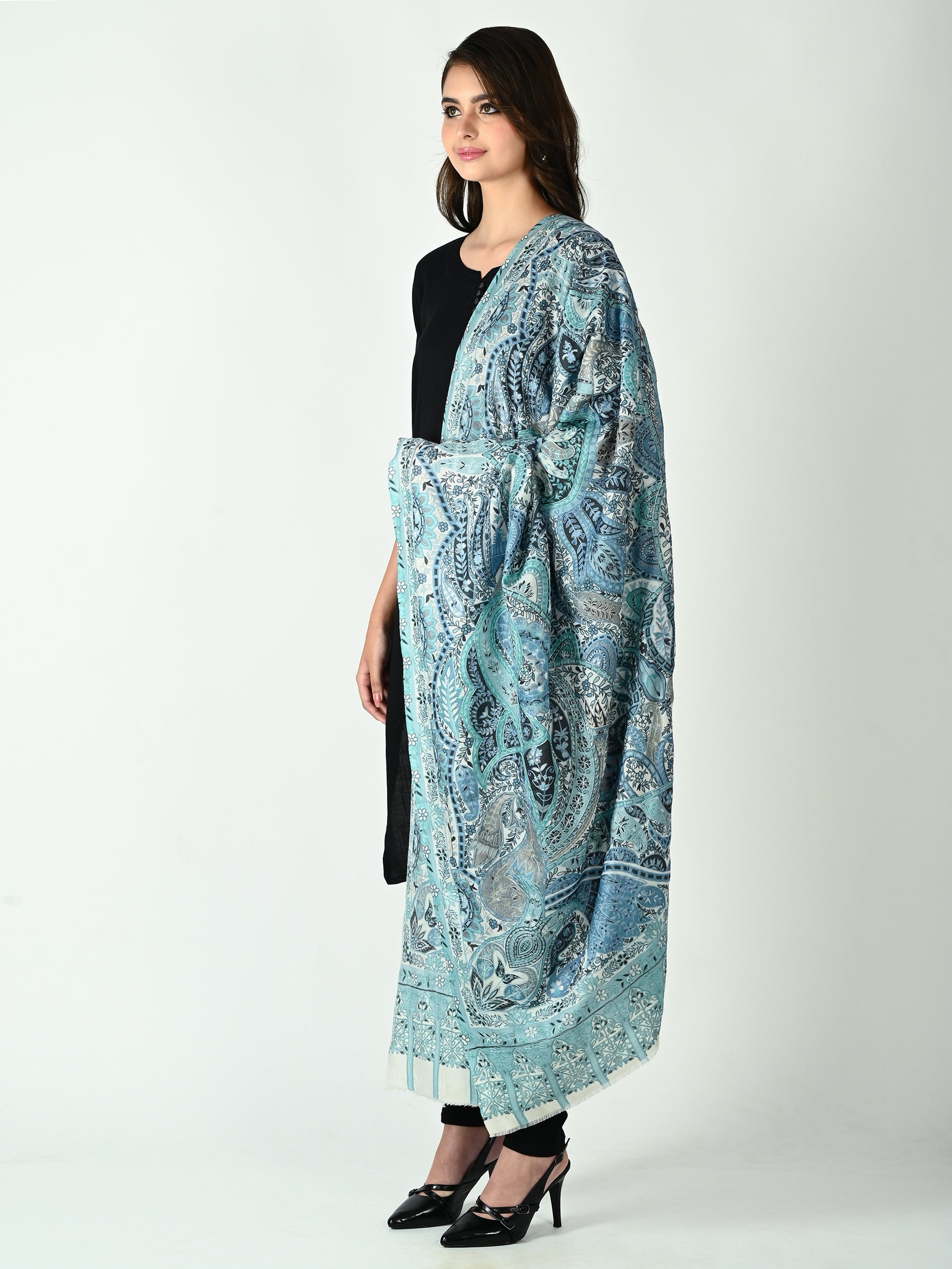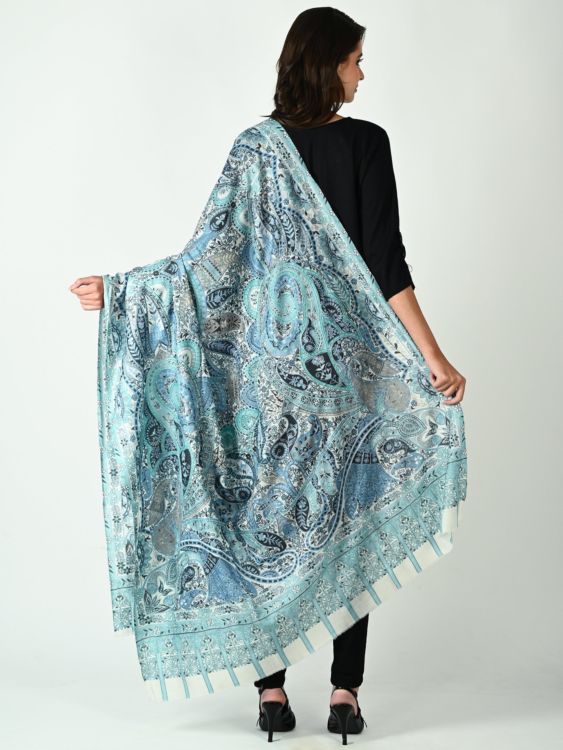 قمری پردہ کالم کاری شال کے ساتھ رات کے آسمان کی پرسکون خوبصورتی میں قدم رکھیں۔ چاند کی نرم چمک سے متاثر ہو کر، اس شاہکار میں گرے، انڈیگوز، لیلاکس اور خاموش ٹیلوں کا خواب جیسا پیلیٹ ہے۔ بہتے ہوئے پیسلے کی شکلیں اور پیچیدہ قلمکاری فنکارانہ ایک آسمانی تال پیدا کرتے ہیں — پرسکون، پراسرار اور بے وقت۔